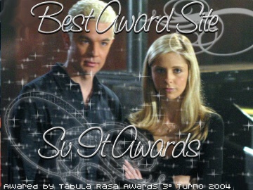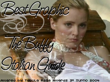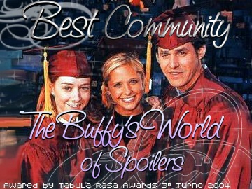 Per quanto riguarda Best Community scelgo The Buffy's World of Spoilers. Si doveva valutare il coinvolgimento dei visitatori. Bhè in Tbwof ho notato il maggior coinvolgimento e il maggior numero di visitatori iscritti. Anche se c'è da dire che Tbwof merita la sua vittoria anche per la fama che si è fatto nel corso di tre anni. Inoltre a questo si aggiunge che le news e gli spoiler arrivano sempre anticipatamente rispetto agli altri siti/newsgroup e gli iscritti li commentano con fervore ^_^.